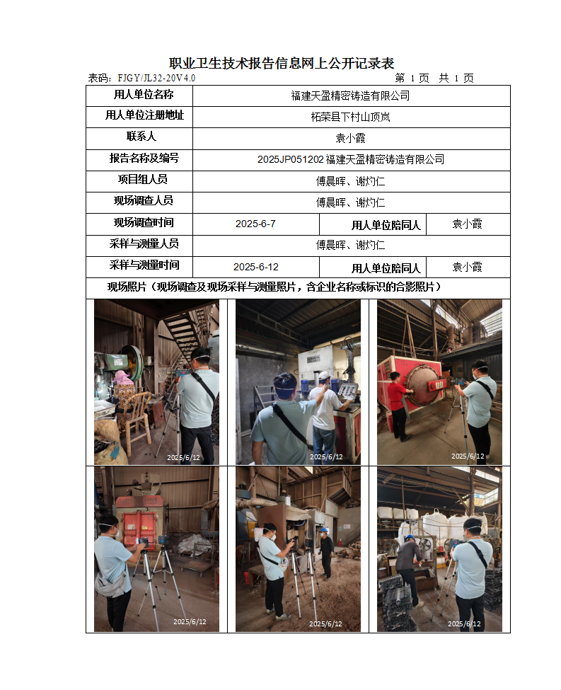 福建天盈精密鑄造有限公司-2025年工作場所職業病危害因素檢測
