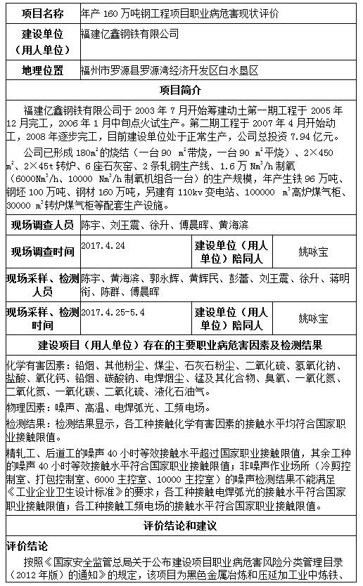 福建億鑫鋼鐵有限公司職業病危害現狀評價-福建共益安全環保科技