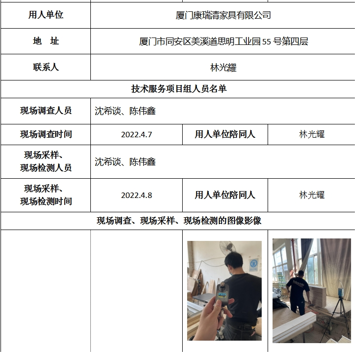 廈門康瑞清家具有限公司2022年工作場所職業病危害因素檢測-福建共益安全環保科技