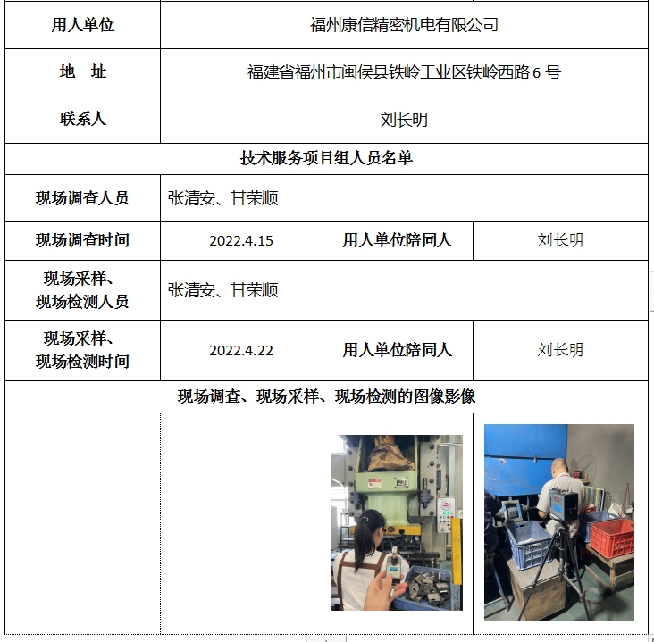 福州康信精密機電有限公司2022年工作場所職業病危害因素檢測-福建共益安全環保科技