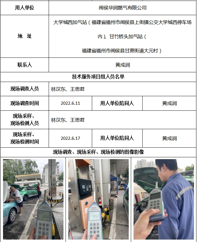 閩侯華潤燃氣有限公司2022年工作場所職業病危害因素檢測