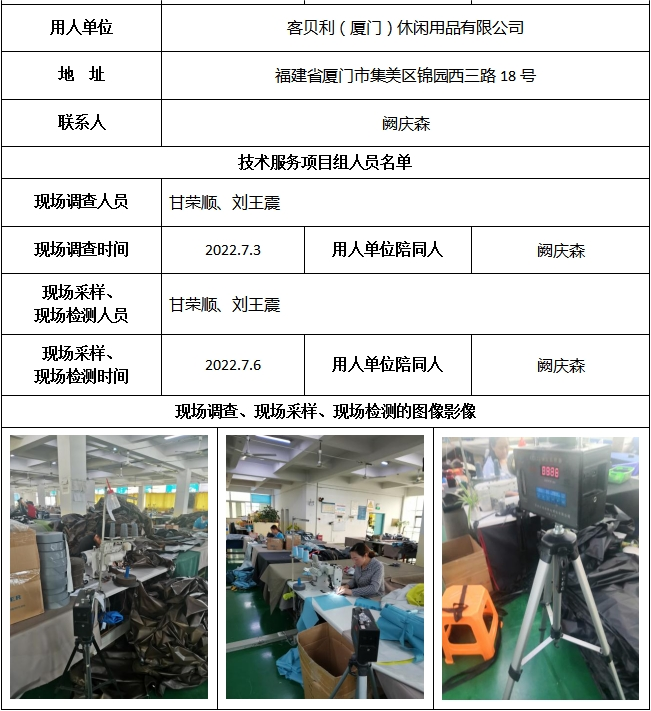 客貝利(廈門)休閑用品有限公司2022年工作場所職業(yè)病危害因素檢測
