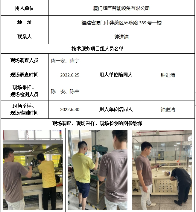 廈門輝巨智能設備有限公司2022年工作場所職業病危害因素檢測