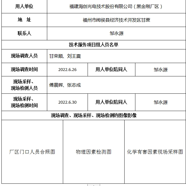 福建海創(chuàng)光電技術(shù)股份有限公司(黑金剛廠區(qū))2022年工作場所職業(yè)病危害因素檢測