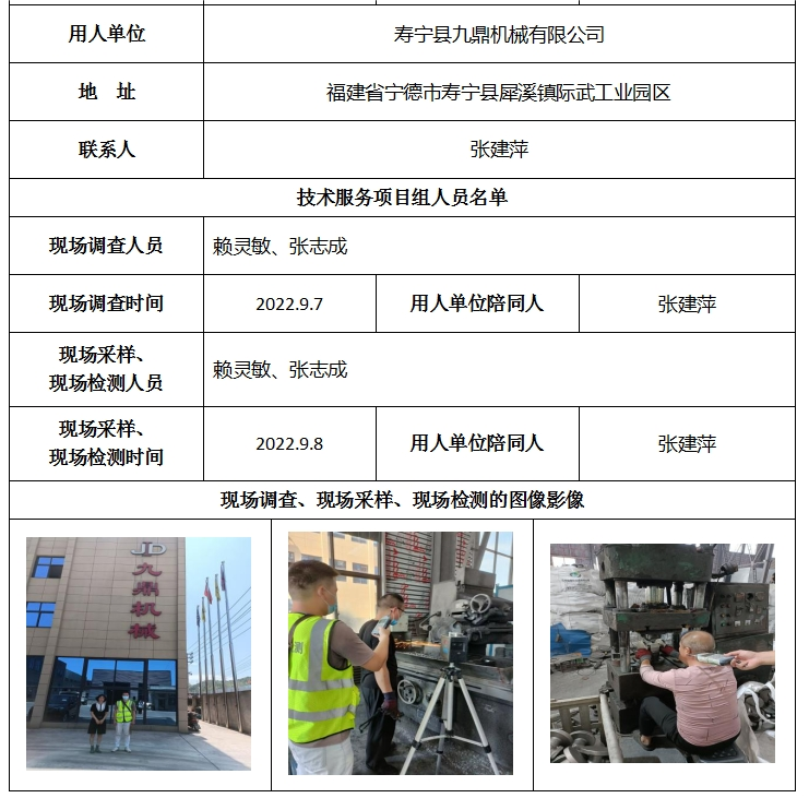 壽寧縣九鼎機械有限公司2022年工作場所職業病危害因素檢測